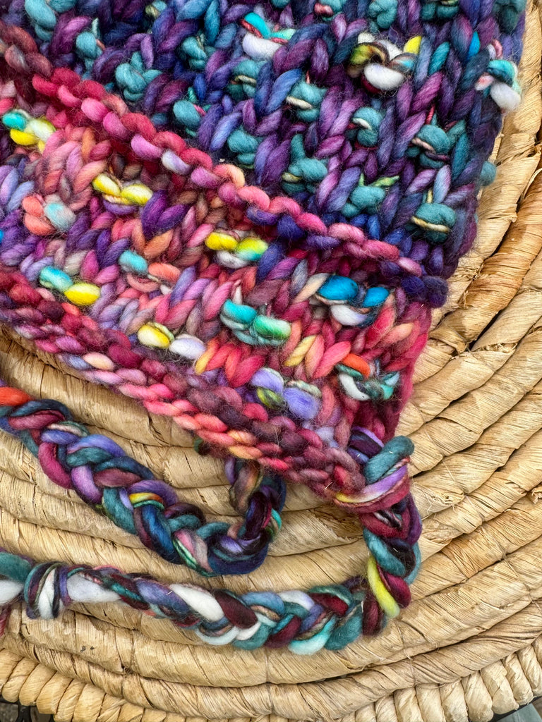 This beanie is made from Malabrigo Rasta in Whales Road, Singlelot Pink/Purple, Teal Feather, and Indie dyed yarn.